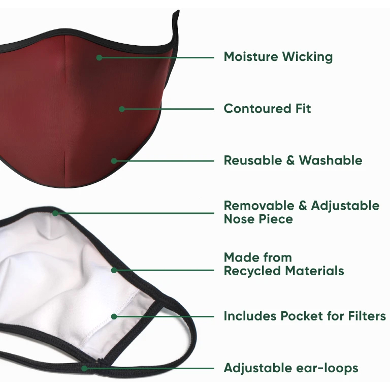 Our reusable face masks are made from polyester that comes from recycled plastic with a bit of added Lycra to retain its shape and give a functional four-way stretch. Lightweight and comfortable for all day wear.